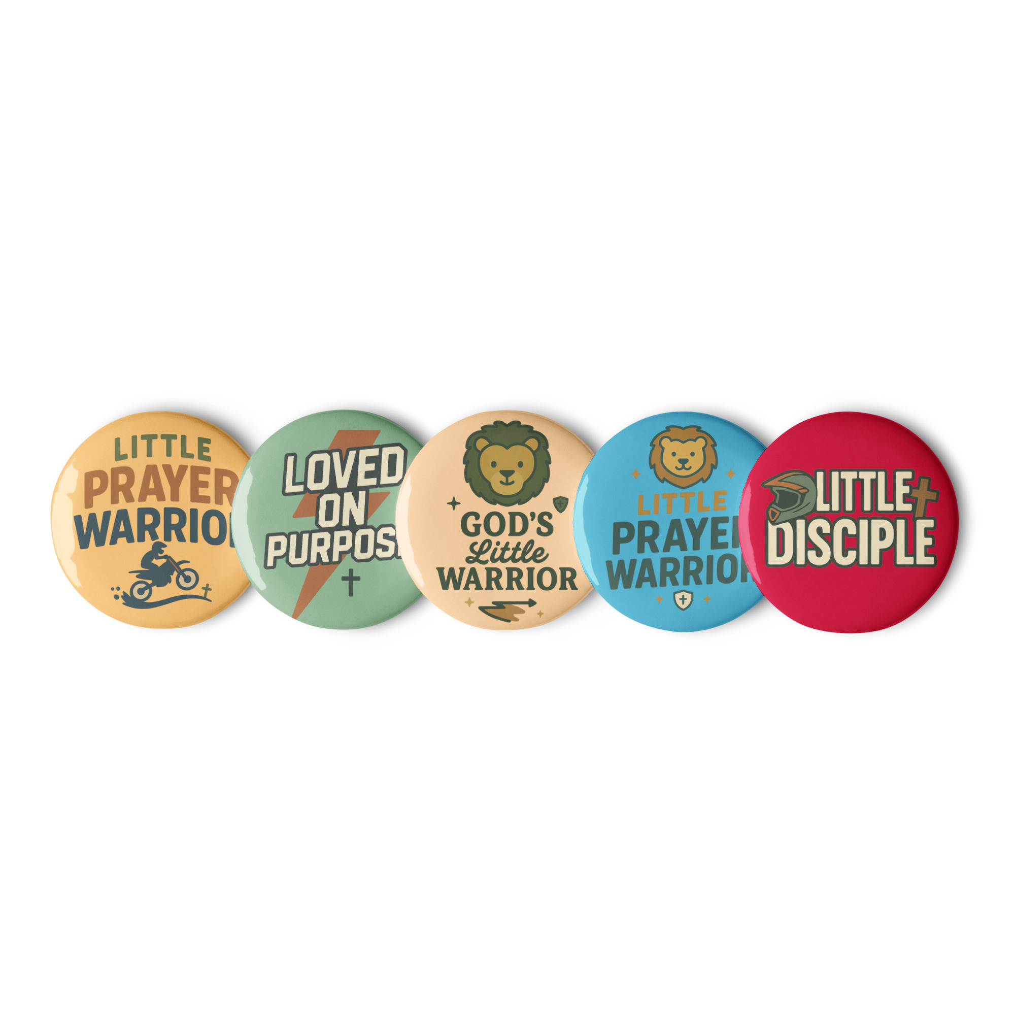 • Faith-filled symbols including crosses, lightning bolts, lions, and adventure-inspired graphics
