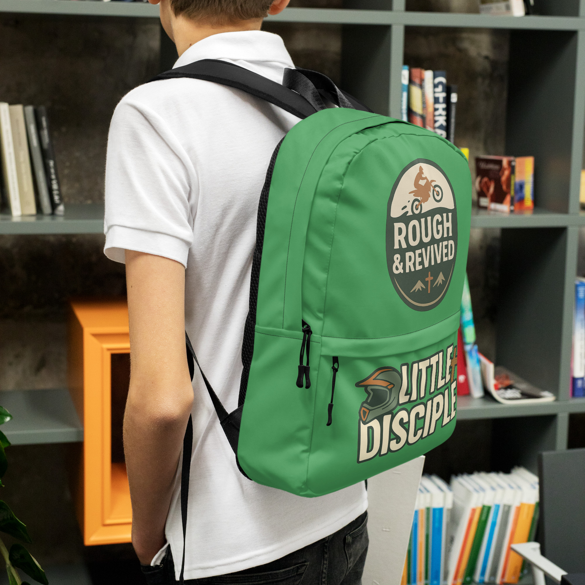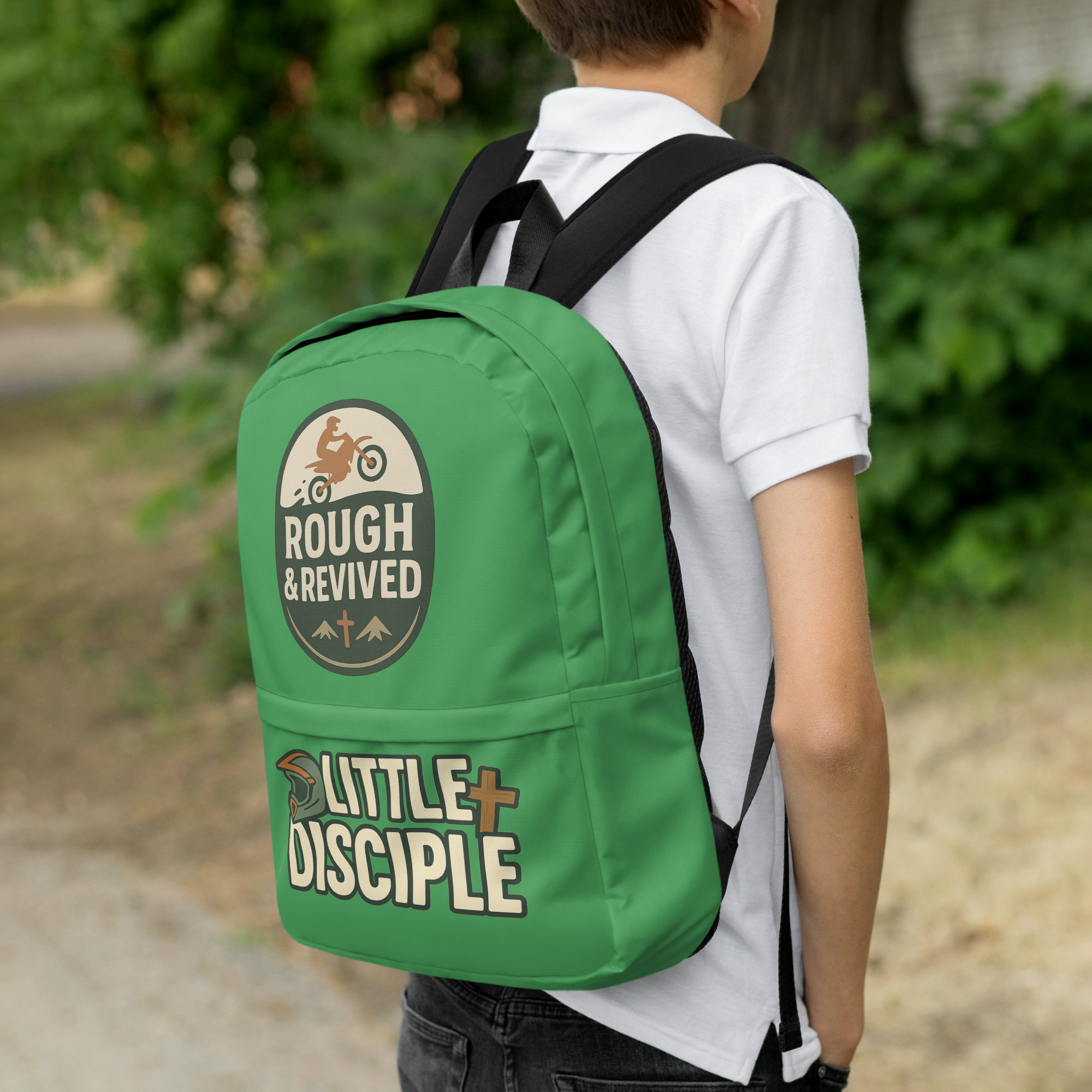 This Little Disciple boys backpack is made for adventurous kids who are learning to walk boldly in faith. Featuring a dirt bike and cross graphic, this design blends energy, purpose, and Christian values into a backpack kids are excited to carry.